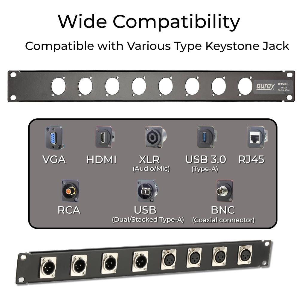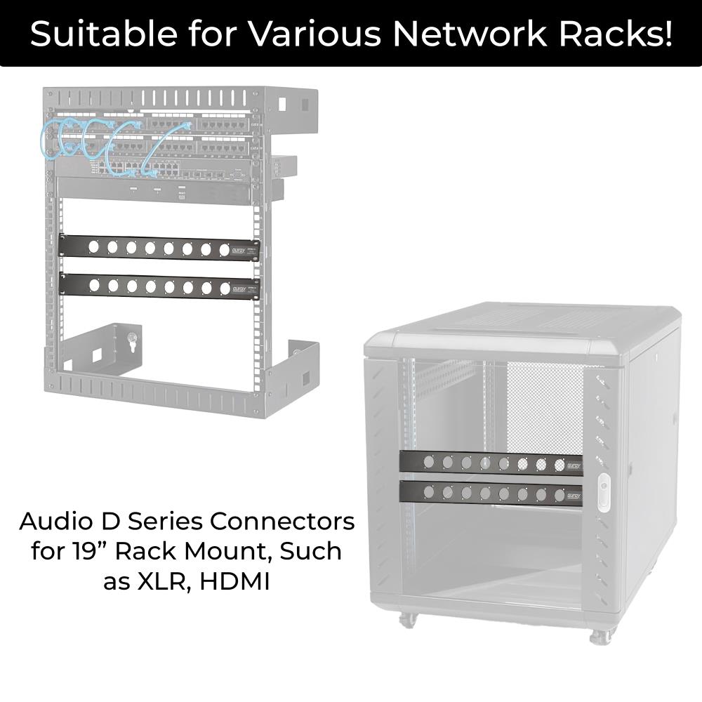 Keep your rack organized and your cable management streamlined with this Auray 1U Rack Panel, designed for up to eight panel mount D-series connectors. This versatile 1 RU panel fits standard 19" equipment racks and supports a wide range of configurations, including speakON, powerCON, XLR, and pass-through adapters—ideal for customizing audio, video, PA, and lighting systems.