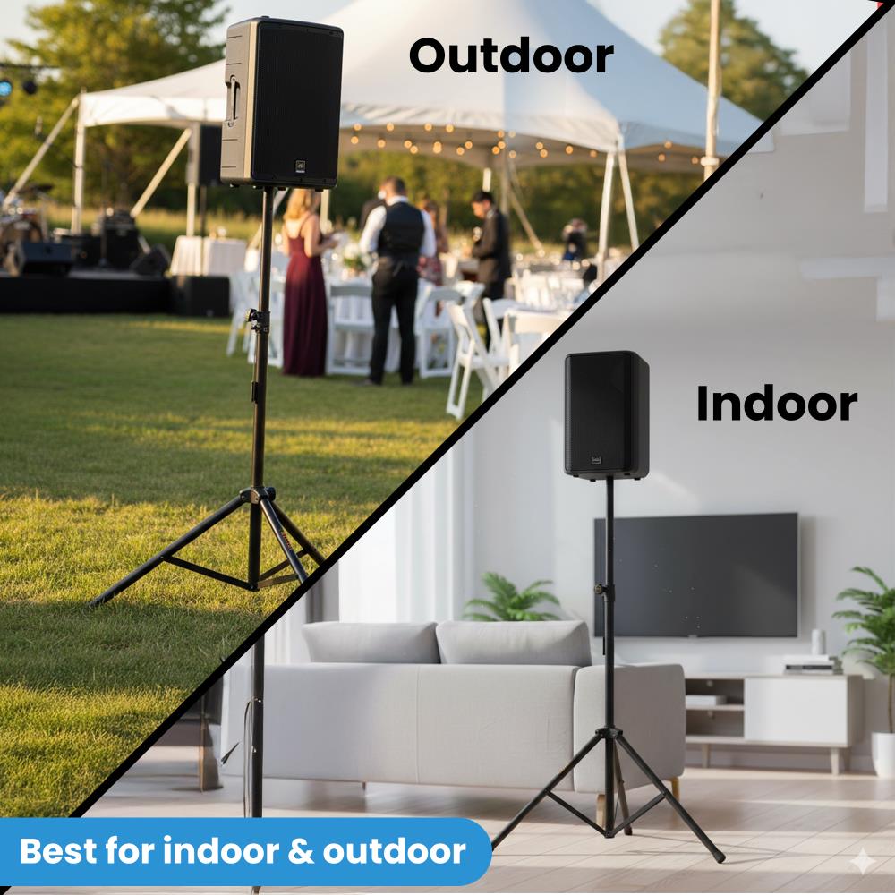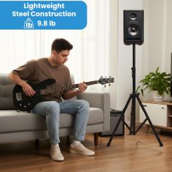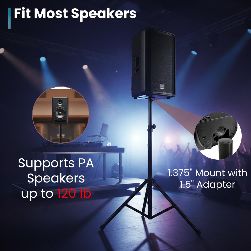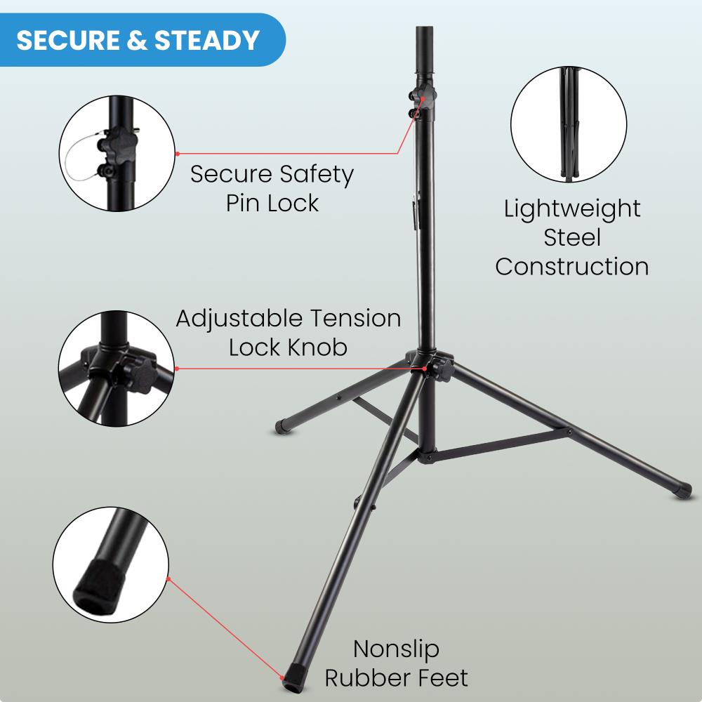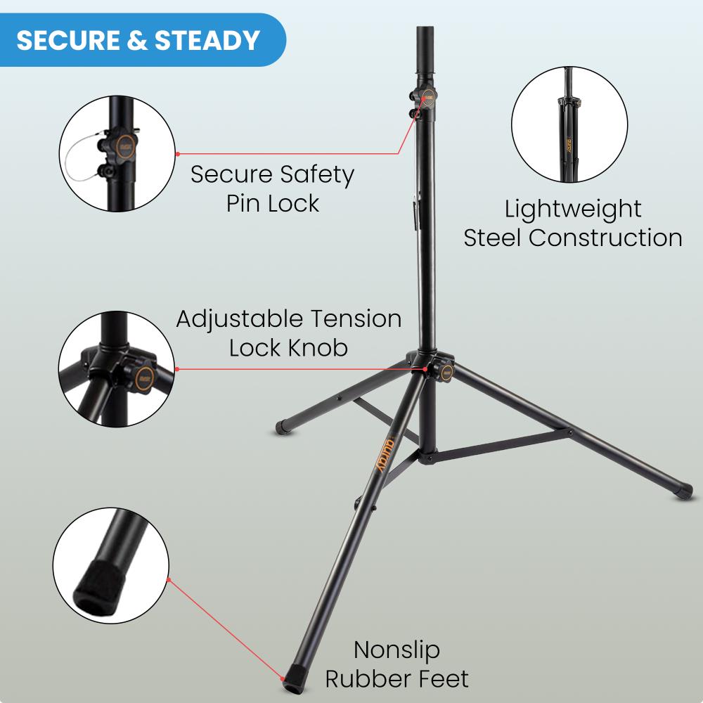 The telescoping center column adjusts from 3.8 to 7.5 feet, allowing optimal speaker placement for improved sound coverage. A sturdy metal locking collar ensures precise height adjustment, while six preset height positions and a locking safety pin provide additional security during use.