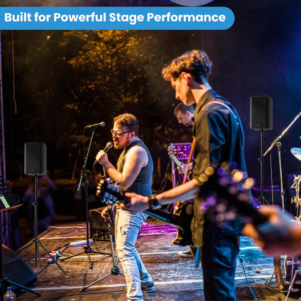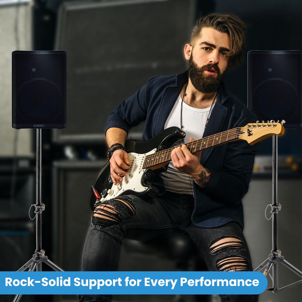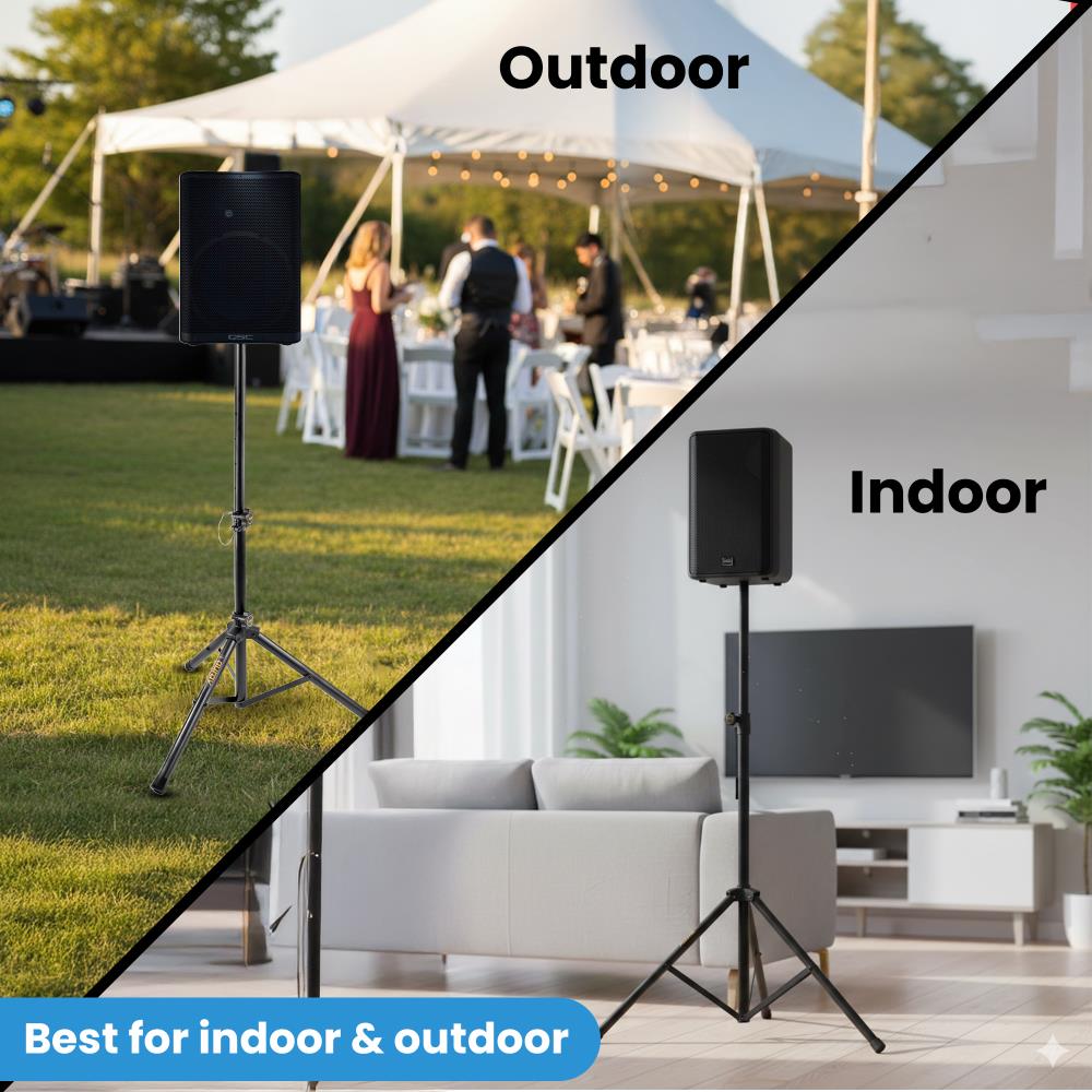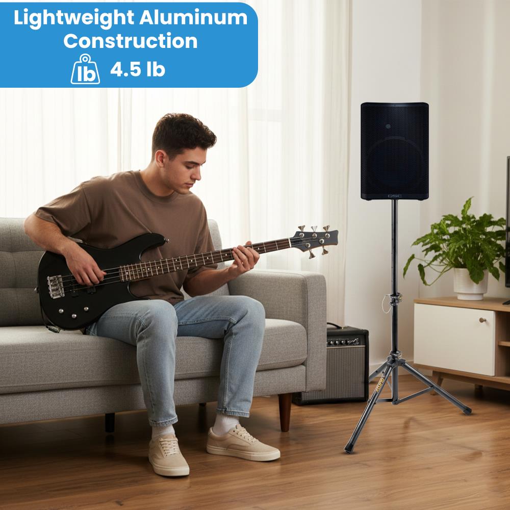 A sturdy tripod base with center bracing enhances overall stability by connecting the legs directly to the main column. This design helps reduce movement and provides solid support, even in busy venues or outdoor settings.