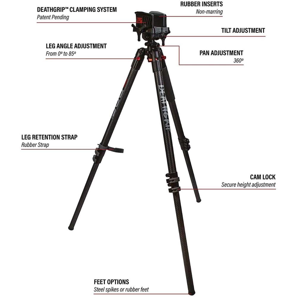 Designed to adapt from prone to standing shots, the tripod adjusts from 7 inches to 59 inches using secure cam lever leg locks for fast setup. The dual-adjustment DeathGrip clamping head with non-marring jaw inserts helps hold your firearm steady, while 360 degree pan with tension adjustment and 25 degrees of cant give you smooth tracking and leveling on uneven terrain.