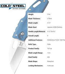 Designed to be tough enough for demanding work yet light enough for convenient carry, the Tuff Lite features a durable blue Griv-Ex handle that delivers an excellent strength-to-weight ratio and a secure, comfortable grip. Cold Steel’s renowned Tri-Ad Lock mechanism adds impressive lock strength and reliability, helping provide safe and confident operation. With its ambidextrous pocket or belt clip and compact 6" overall length, this folding knife is well suited for everyday carry, jobsite tasks, utility use, and outdoor applications.