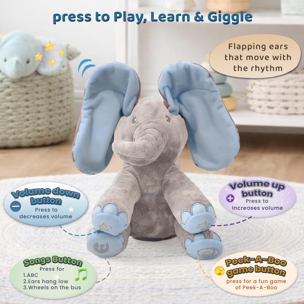 Kyle is a delightful singing elephant baby toy with floppy ears, featuring two engaging play modes that captivate children of all ages. Press his right foot to hear cheerful renditions of the "ABC" song, "Do Your Ears Hang Low," and "Wheels on the Bus." Press his left foot to start a playful game of peek-a-boo, where Kyle hides his eyes with his large, soft ears. Easily adjust the volume to the perfect level for your child’s playtime setting, making Kyle an ideal peekaboo elephant for baby entertainment.