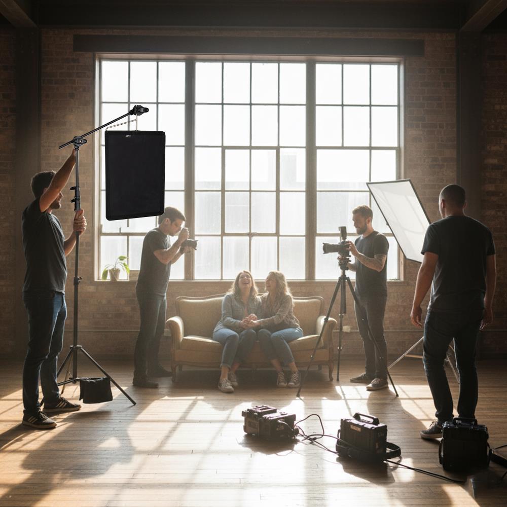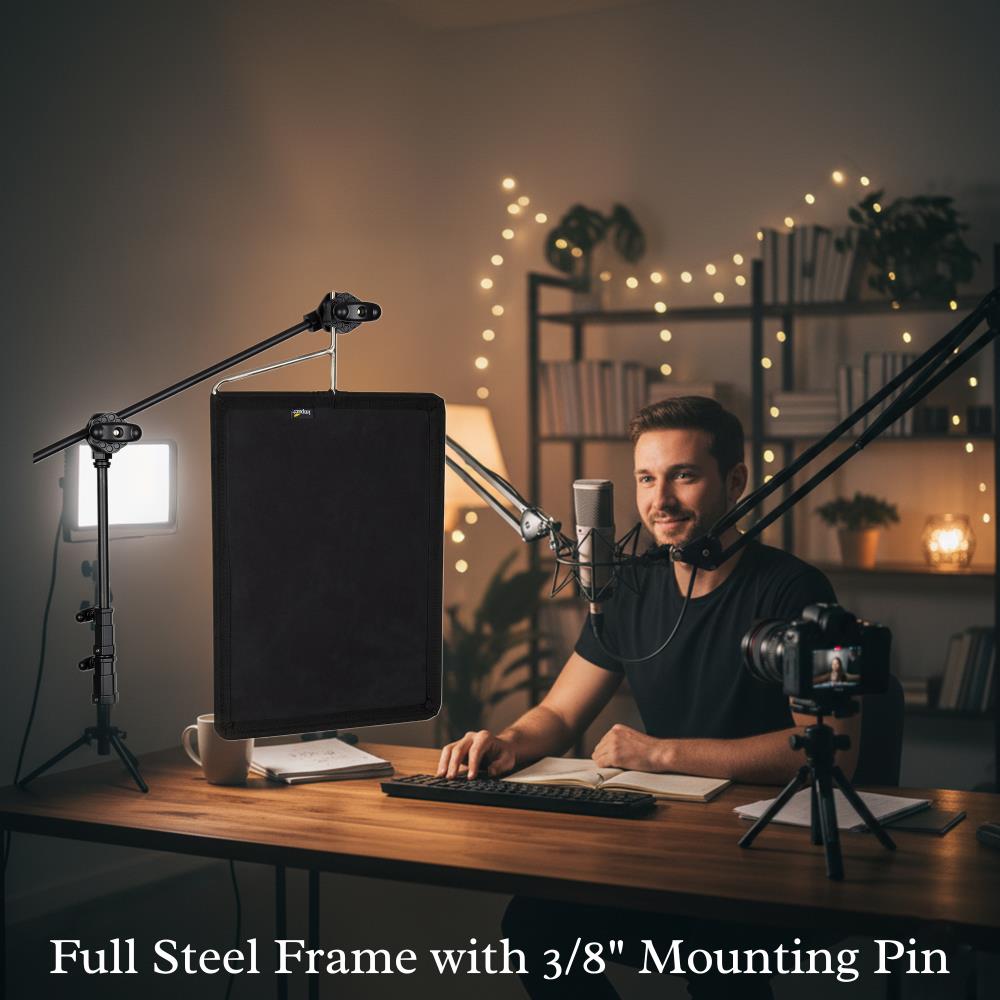Built for durability and compatibility, the flag features a full steel frame with a 3/8" mounting pin that easily attaches to standard grip heads, C-stands, or light stands. This makes it a versatile tool for shaping light, controlling reflections, and improving overall lighting quality during photo shoots, film productions, interviews, and video recording.