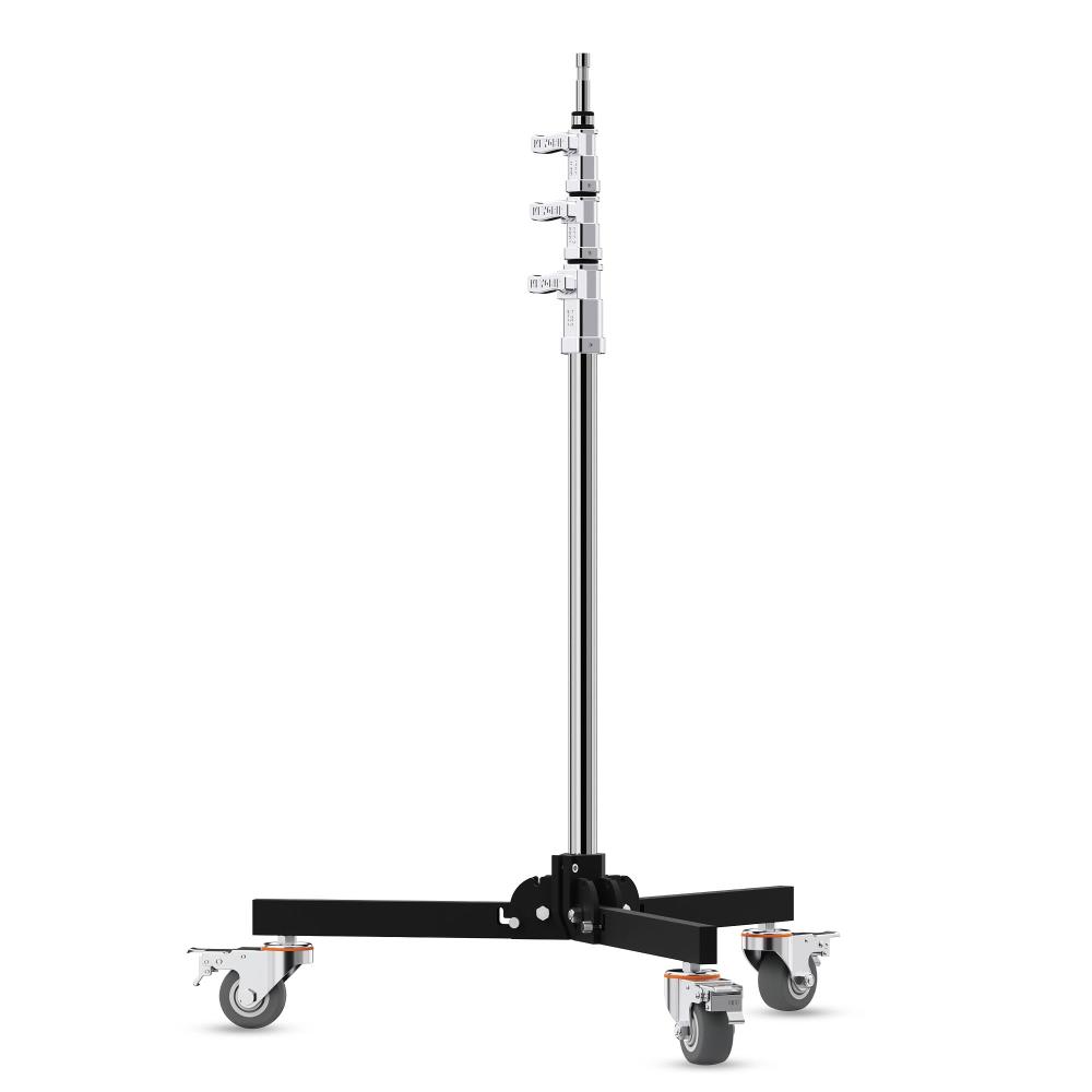 The 11' Baby Folder Roller Stand is engineered for professional video, photography, and cinematography applications requiring stable and mobile support. Its 3-stage steel riser system provides a wide working height range from 39.4 to 133.9", while maintaining a dependable 22 lb load capacity for lighting fixtures and grip accessories.