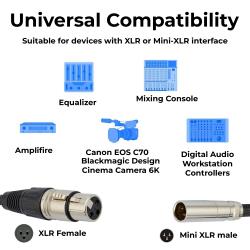 The Kopul MX-XLF16 cable allows direct connection between professional microphones or audio mixers and your camera, eliminating the need for extra adapters. Its mini 3-pin XLR male connector plugs into the camera’s 48V mono input, while the 3-pin XLR female connector attaches to your audio source. The 16" length is ideal for compact setups, maintaining a neat and organized workspace. This cable is perfect for filmmakers, videographers, and content creators who need dependable, high-quality audio without signal interference.