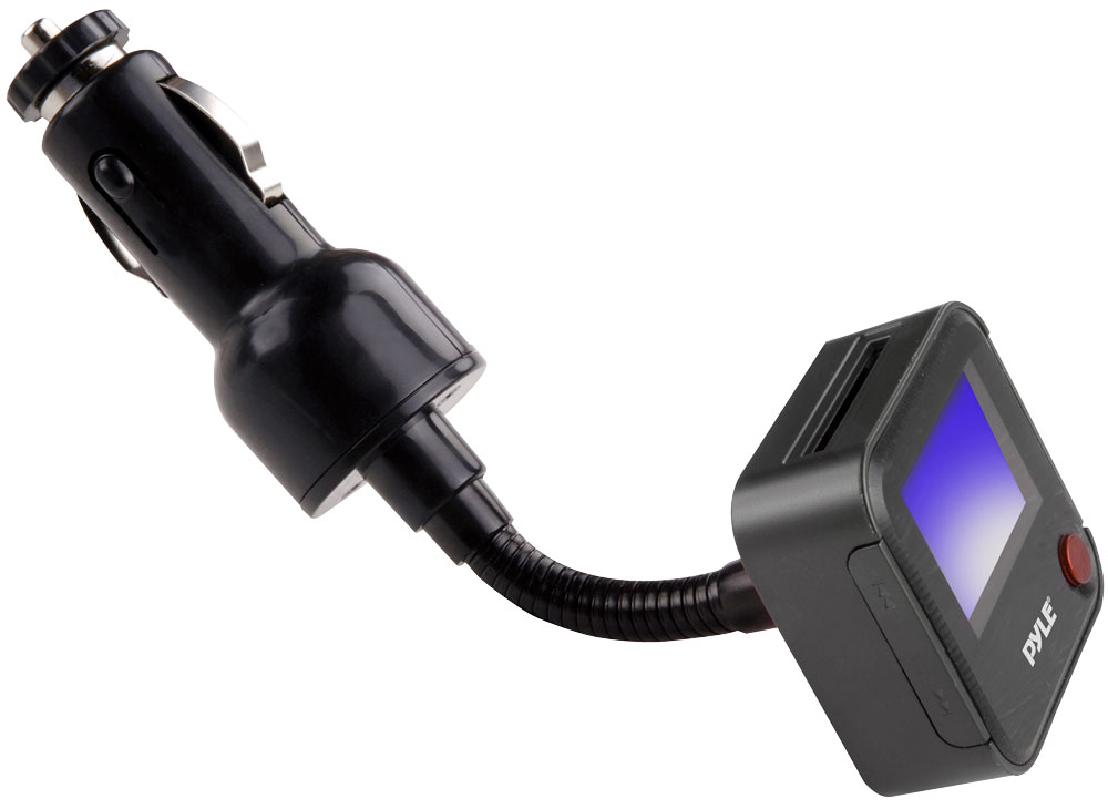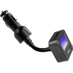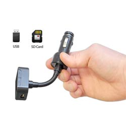 This is an FM transmitter that plugs into your car's cigarette lighter. Equipped with a digital LCD display, line-in function, and USB and SD card inputs, it's capable of playing MP3s and WMAs from all sorts of formats. Hook up your iPod with the 3.5mm jack, or plug in a USB stick with your favorite music. The FM transmitter operates on over 200 different channels from 87.5 to 108 MHz, so you'll be able to find the perfect station for streaming your music. The screen displays ID3 tags and relevant track information. The metallic hose neck easily adjusts for your convenience. Color: black.