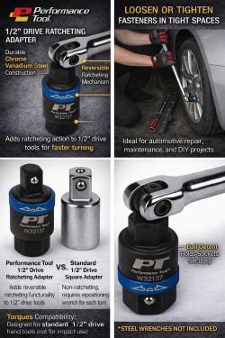 This Performance Tool 1/2″ Drive Ratcheting Adapter is designed to add ratcheting functionality to non-ratcheting hand tools, improving efficiency and ease of use in tight spaces. The reversible ratcheting mechanism allows quick direction changes without removing the tool, while the chrome vanadium steel construction ensures durability for automotive, garage, maintenance, and DIY applications. Intended for hand tool use only.