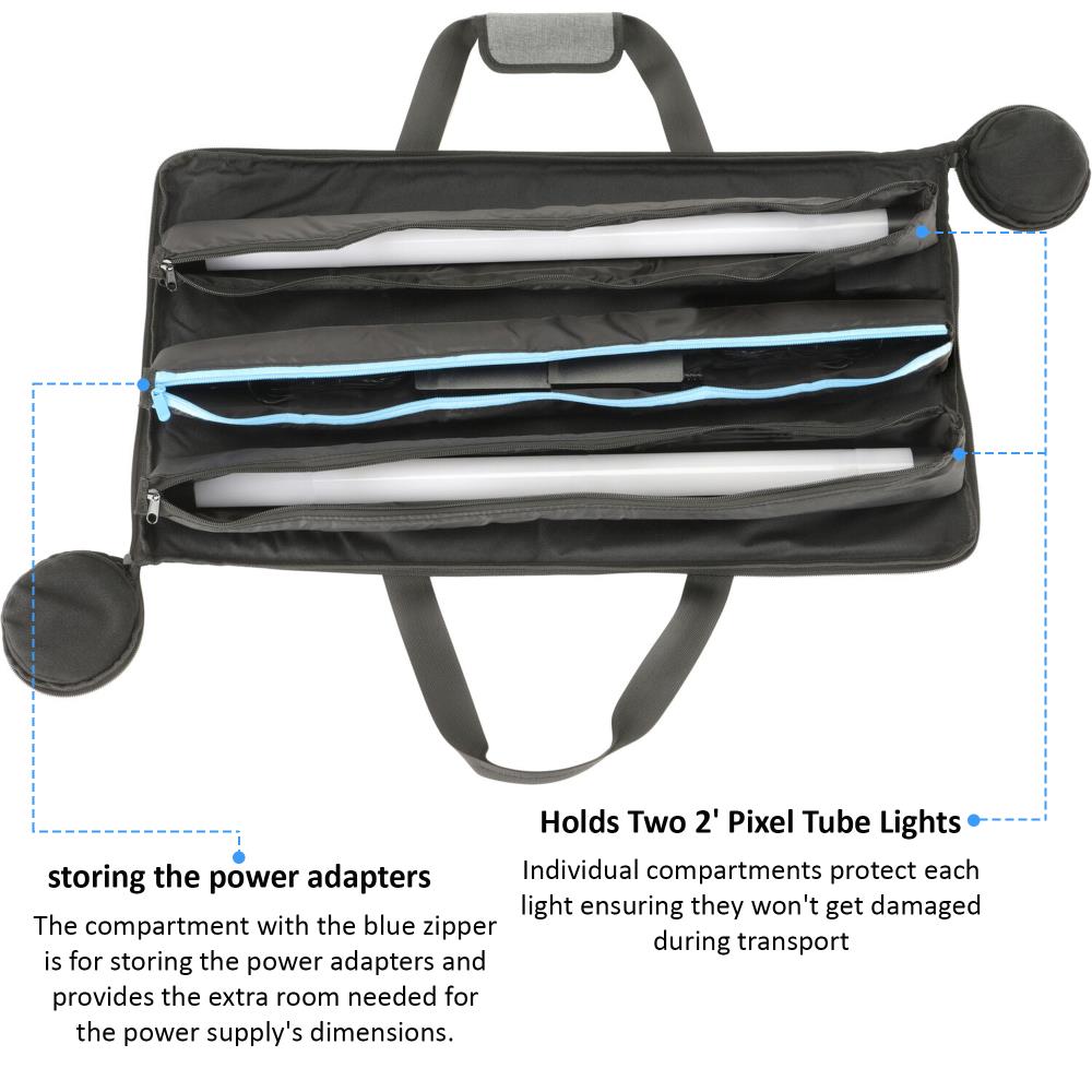 TheGenaray Light Bag for Two 2' RGB Pixel LED Tubesis an essential accessory for photographers, videographers, and filmmakers who require reliable and convenient storage for their lighting equipment. This versatile bag is specifically designed to hold and protect up to two 2' Genaray PX2-RGB Pixel LED Tube Lights. With individually padded and zippered compartments for each light, as well as an additional padded compartment for power adapters and cords, this bag ensures that your gear stays safe and organized during transport.