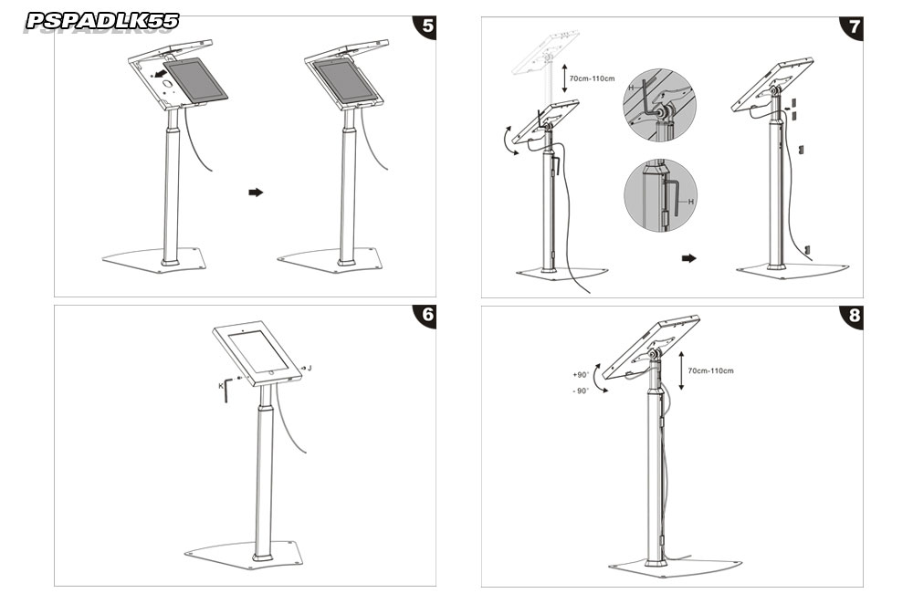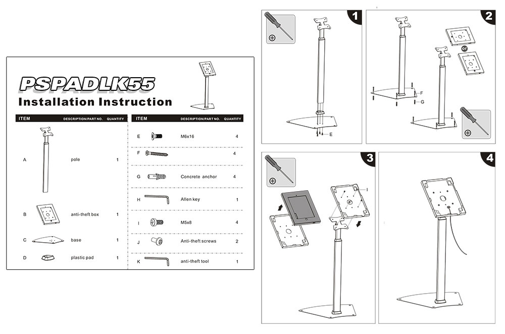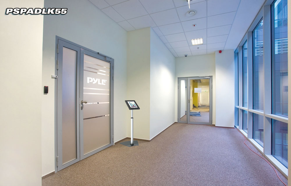 Safely and securely place your iPad on display. The Pyle PSPADLK55 iPad enclosure and stand provides companies and merchants with a simple, state of the art, solution for information access and digital signage. Reinforced kiosk is constructed from fortified steel and heavy-duty aluminum ensuring the safety of your device when inserted. Use the iPad safety enclosure in high traffic areas such as front desks, lobbies, customer counters, work desks, or on showroom floors. With access to the Home button, users will be able to interact with on screen content and navigate programming and menus. Features include height adjustable device placement, internal cable routing and cable management system and ability to mount your iPad in landscape or portrait mode with up to 90° of vertical mobility. Give customers or guests iPad access when you secure the stand in place and bolt it down. Works with all 2nd, 3rd & 4th generation iPads. Mount your iPad where you need it and provide convenient device access with the Pyle PSPADLK55 iPad safety display kiosk. Compatible with iPads 2/3/4/Air.