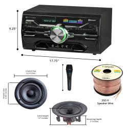 The Technical Pro Home Theater Kit is built for audio perfectionists. Inside the box: a 2-channel 2000W Bluetooth amplifier (USB/SD, FM, HDMI, RCA, AUX, optical, dual mic inputs), eight 5.25" frameless ceiling speakers (175 W each), a dynamic cardioid microphone with a 10 ft cable, 250 ft 16-gauge speaker wire, 4-Ch Speaker Selector, a remote, FM antenna, HDMI and audio/video cables, power cord, and instructions. Ideal for custom installs in homes, restaurants, or small venues.