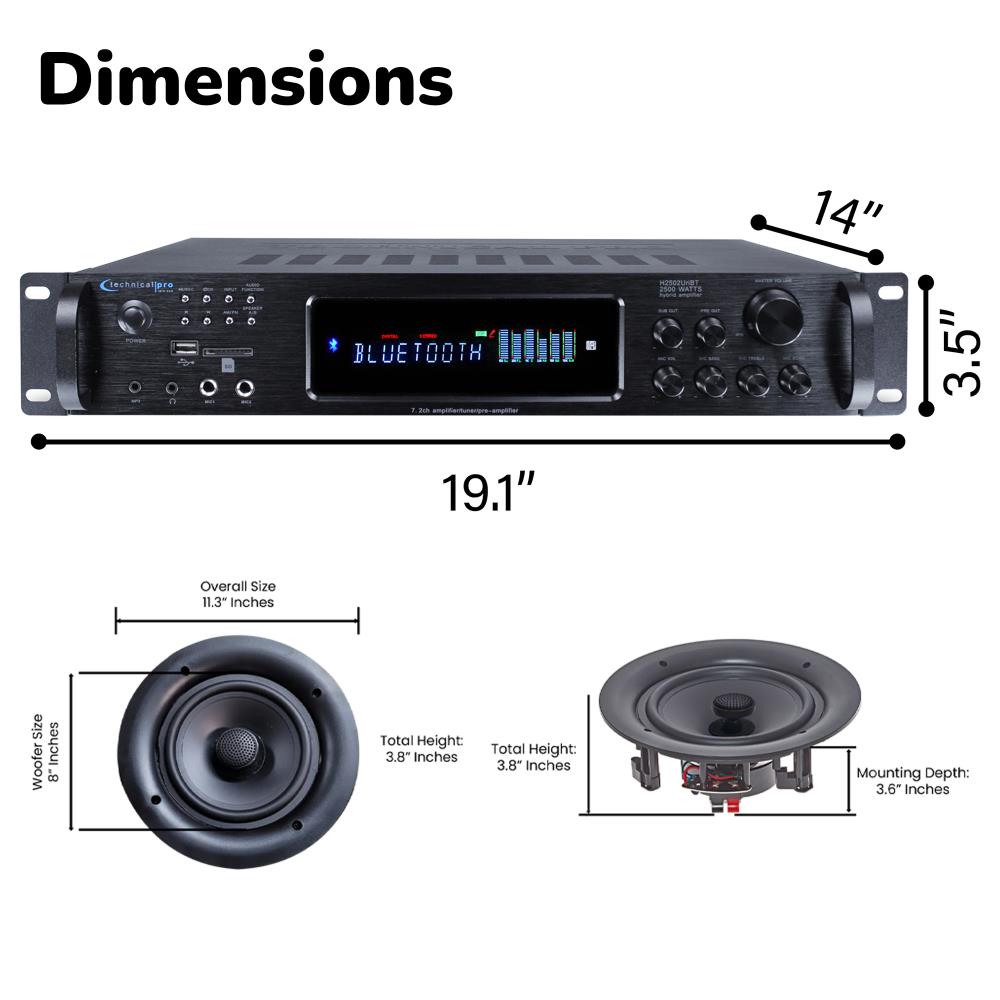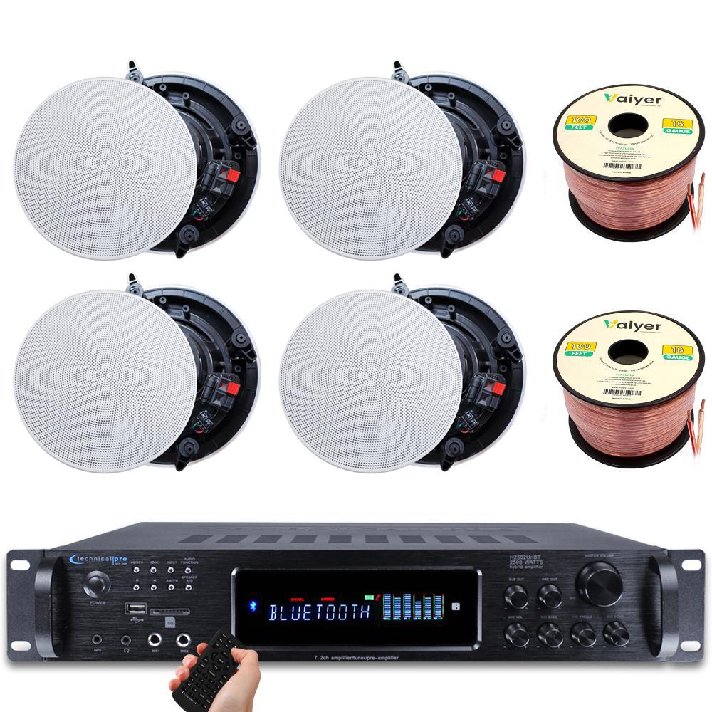 Free ShippingTechnical Pro 1000 W 4 Channel Bluetooth Home Stereo Receiver Bundle w/ 6.5" (4 QTY) of 200 W Flush Mount in-Wall in-Ceiling 2-Way Framed Speakers, Home Theater System- Office, Living Room