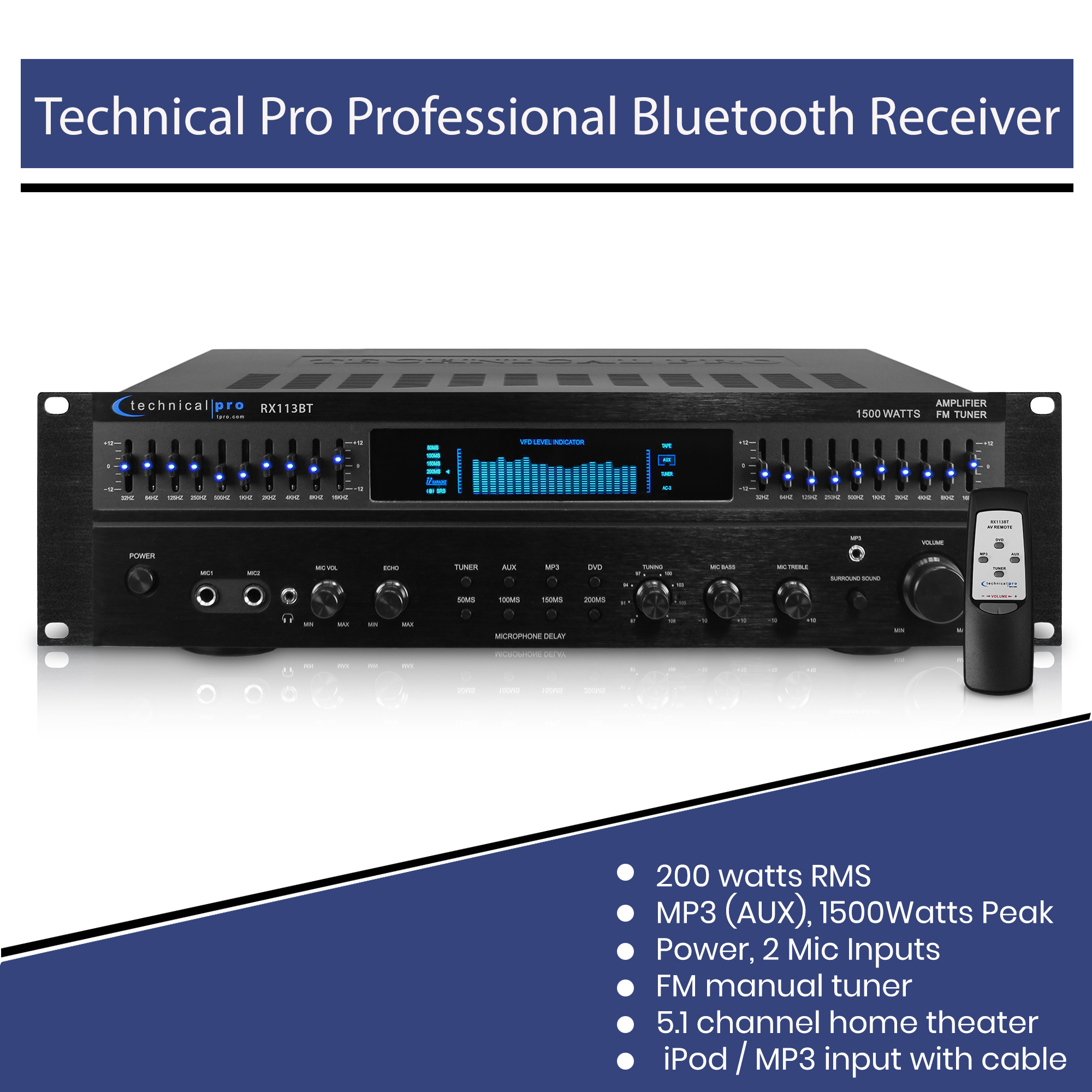 Technical Pro - TPRX113BT Technical Pro Professional 1500 watts Power Bluetooth Receiver with Built-In Equalizer, 5.1 Channel Home Theater, Dual Mic Inputs, 5 Band EQ & FM Radio
