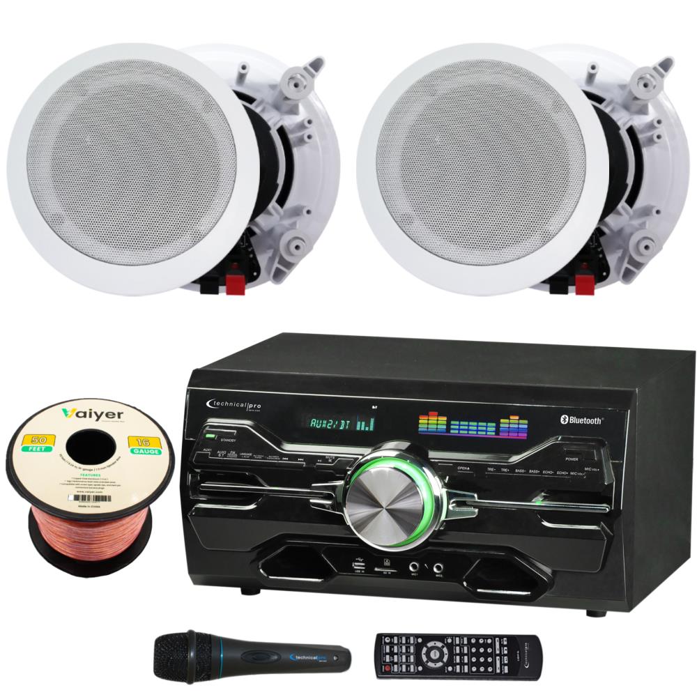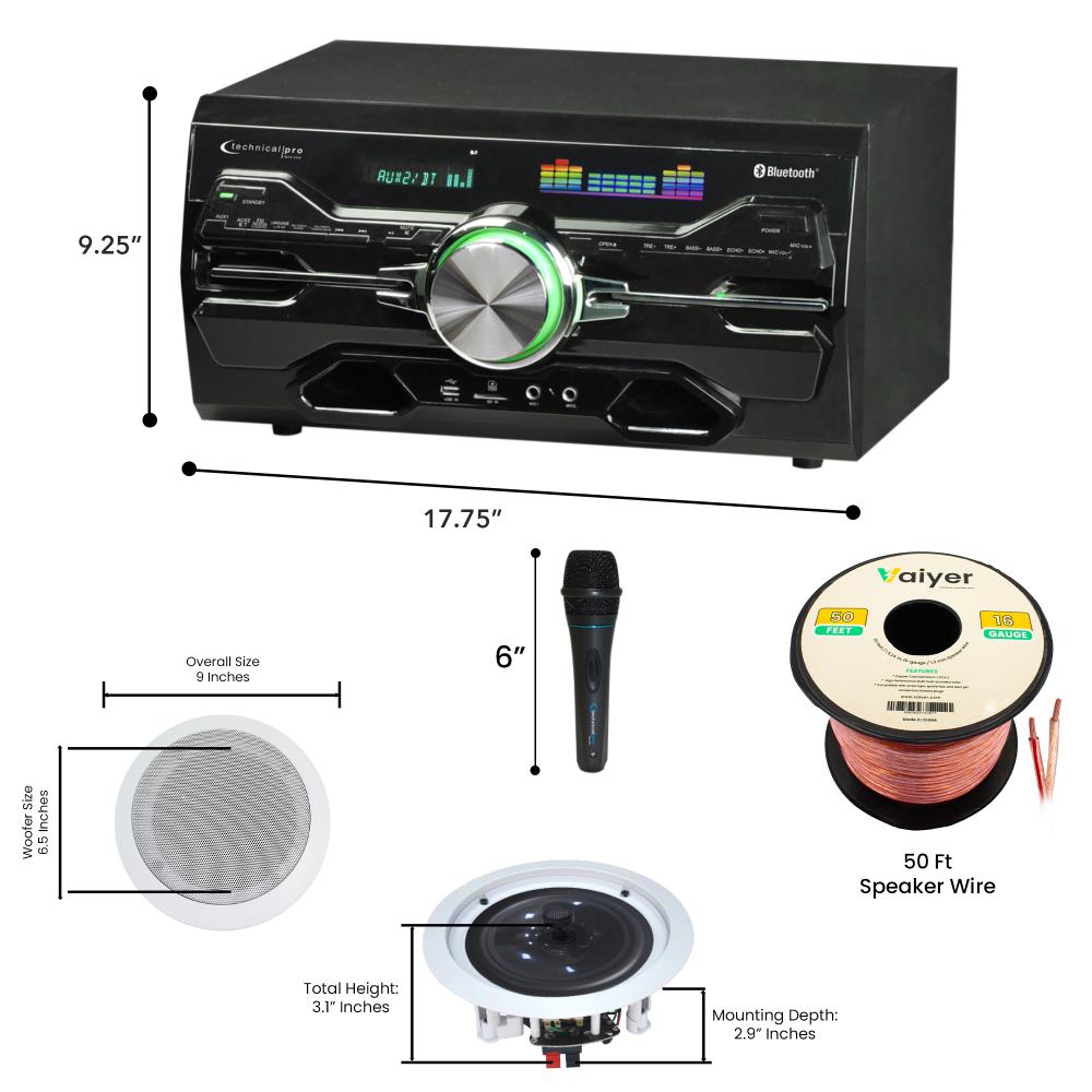 The Technical Pro Home Theater Kit is built for audio perfectionists. Inside the box: a 2-channel 2000W Bluetooth amplifier (USB/SD, FM, HDMI, RCA, AUX, optical, dual mic inputs), two 6.5" framed ceiling speakers (200W each), a dynamic cardioid microphone with a 10 ft cable, 50 ft 16-gauge speaker wire, a remote, FM antenna, HDMI and audio/video cables, power cord, and instructions. Ideal for custom installs in homes, restaurants, or small venues.