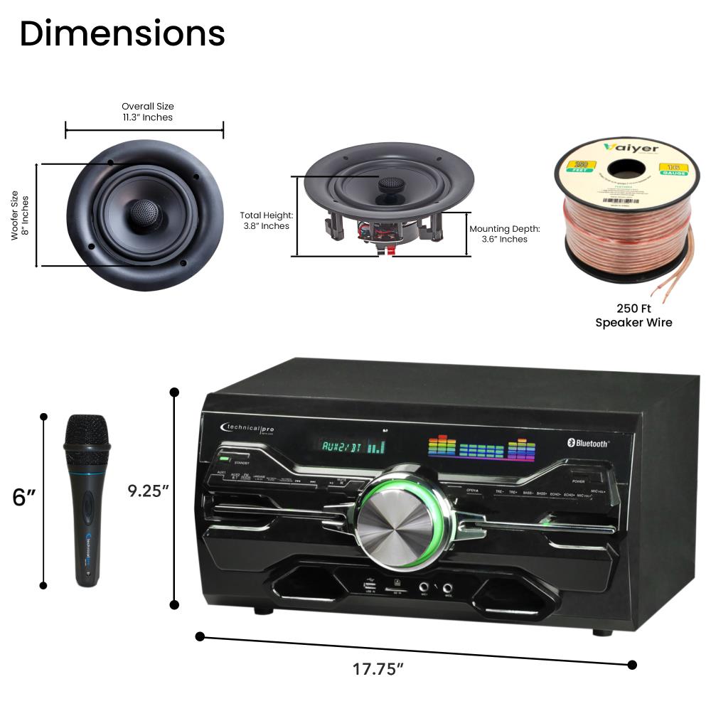 Experience immersive sound with the Technical Pro Home Theater System Kit—a complete audio solution featuring a 2-channel 2000W Bluetooth amplifier, 4 powerful 8" frameless ceiling speakers (300W each), a professional wired microphone with a 10 ft XLR to 1/4" cable, 250 ft of 16-gauge speaker wire, remote control, FM antenna, HDMI, audio/video cables, power cord, and a user manual. Perfect for home theaters, offices, restaurants, and events, this all-in-one bundle delivers crystal-clear audio, easy installation, and versatile performance.