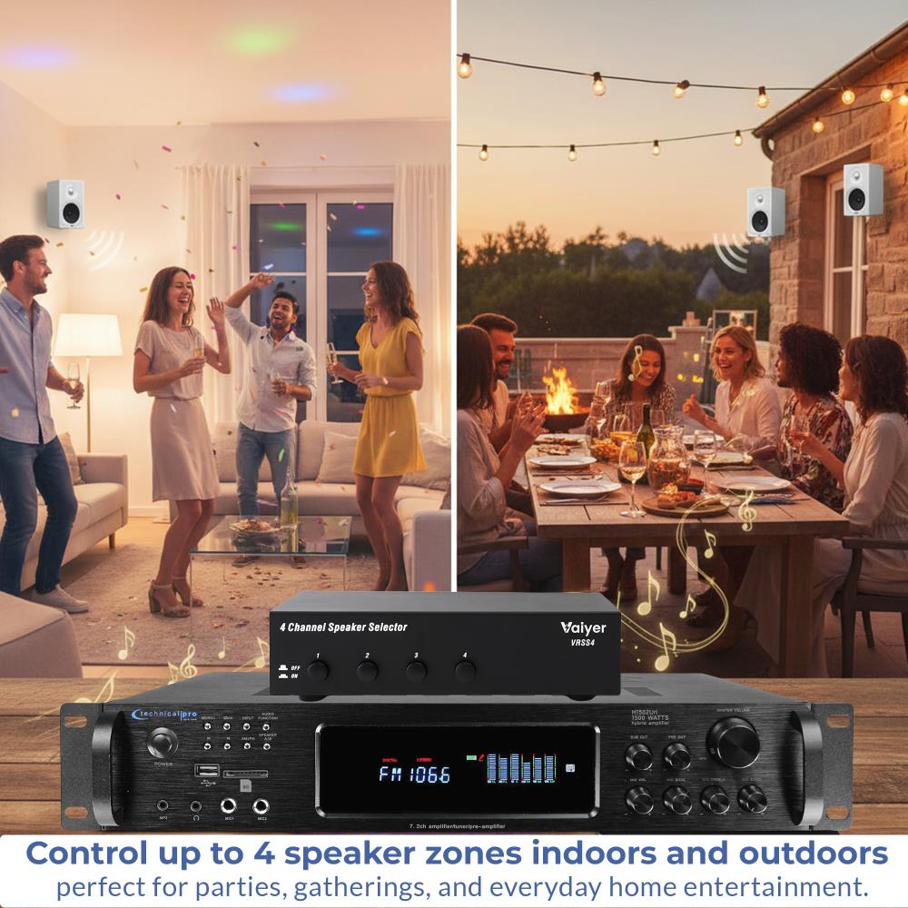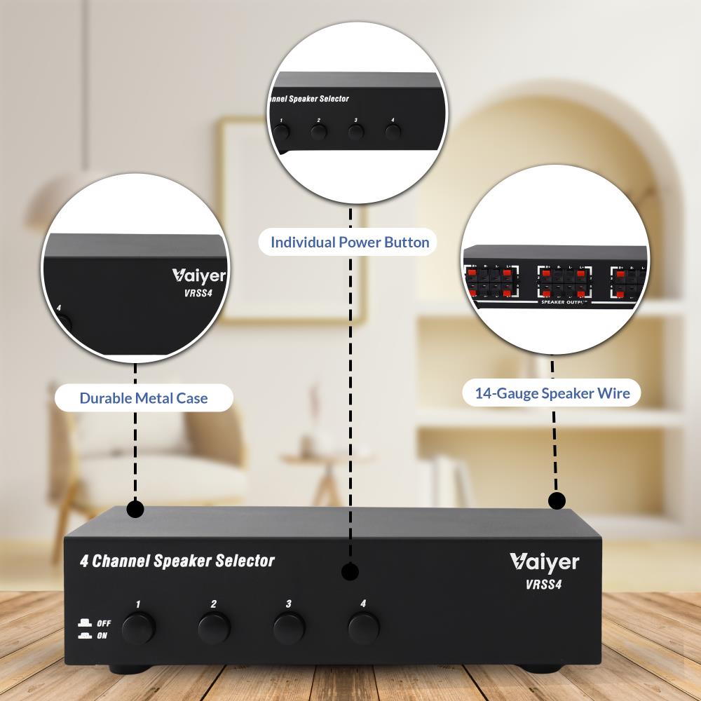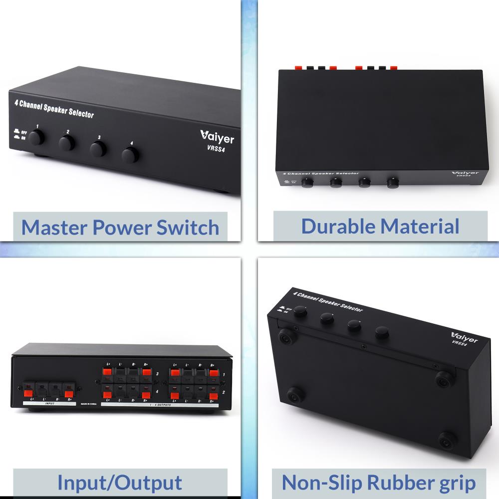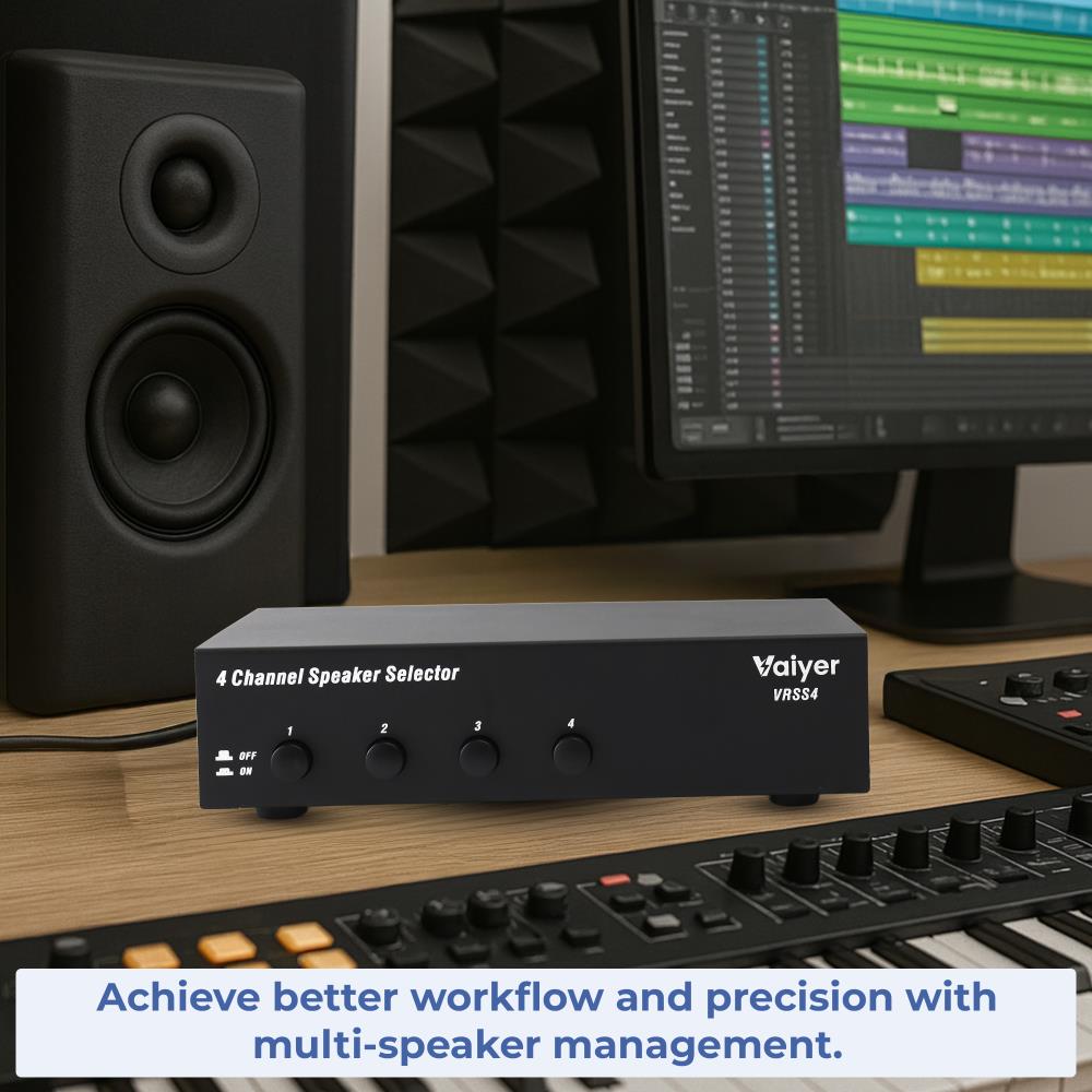 Bring your home audio system to life with the Vaiyer VRSS4 4-Channel Speaker Selector. Designed for homeowners and music lovers who want sound in multiple rooms, this compact yet powerful unit lets you connect up to four pairs of speakers to a single amplifier or receiver. Whether you want to play soft background music in the kitchen, upbeat tracks in the living room, or stream a podcast in your office, the VRSS4 makes it simple to control each channel individually.