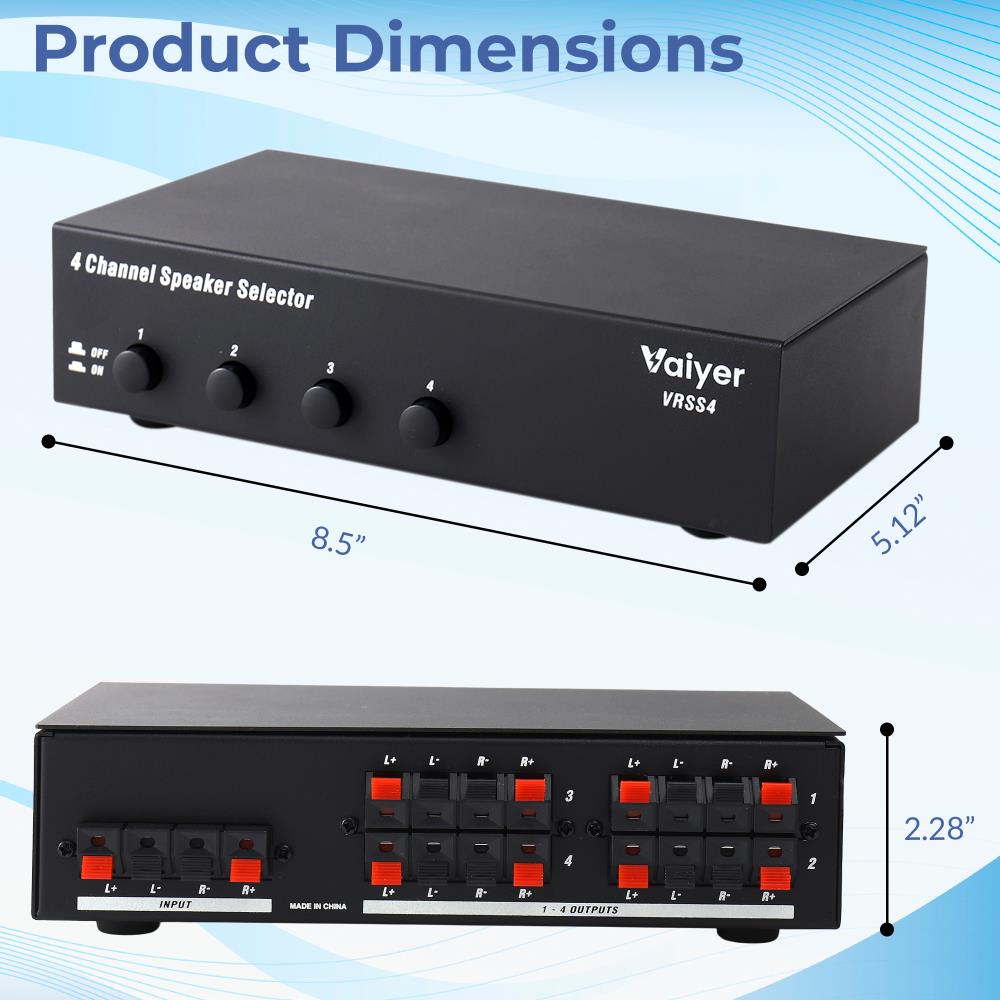 With a maximum power handling capacity of 600 watts (300W RMS), the VRSS4 is more than capable of driving high-performance speakers for clear, room-filling sound. Its sturdy metal construction, spring-loaded terminals, and compact footprint make installation quick and secure while ensuring long-lasting durability. Perfect for apartments, small homes, or light commercial use, the Vaiyer VRSS4 offers professional-grade audio control in a user-friendly package.