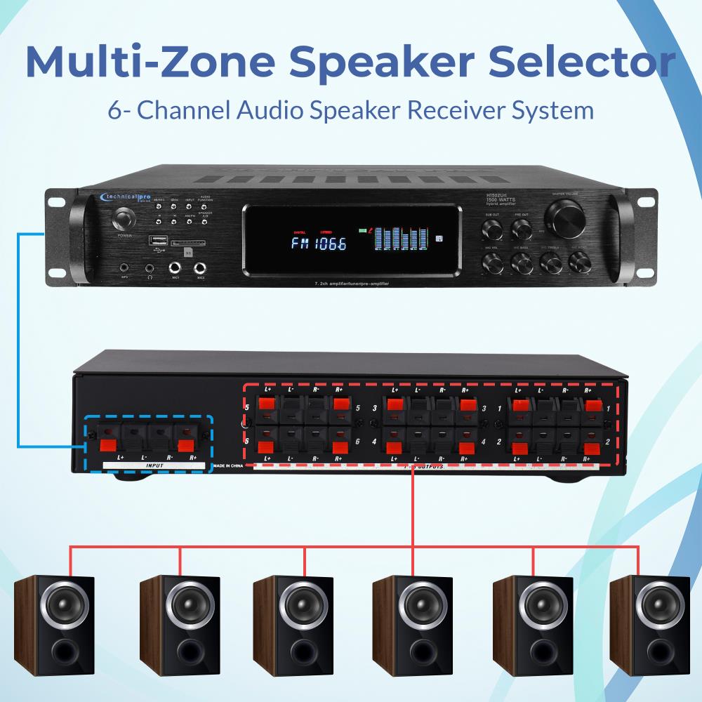 Technical Pro 6 Zone 6000 W Bluetooth Hybrid Amplifier Tuner Kit w/ 5.25" (8 QTY) 175 W in-Wall in-Ceiling Frameless Speakers w/ Remote Control, Home Theater System - For Office, Living Room