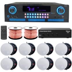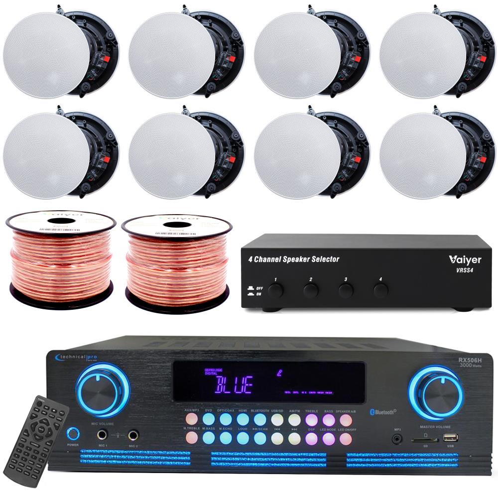 Technical Pro 1000 W 4 Channel Bluetooth Home Stereo Receiver Bundle w/ 6.5" (8 QTY) of 200 W Flush Mount in-Wall in-Ceiling 2-Way Framed Speakers, Home Theater System- Office, Living Room