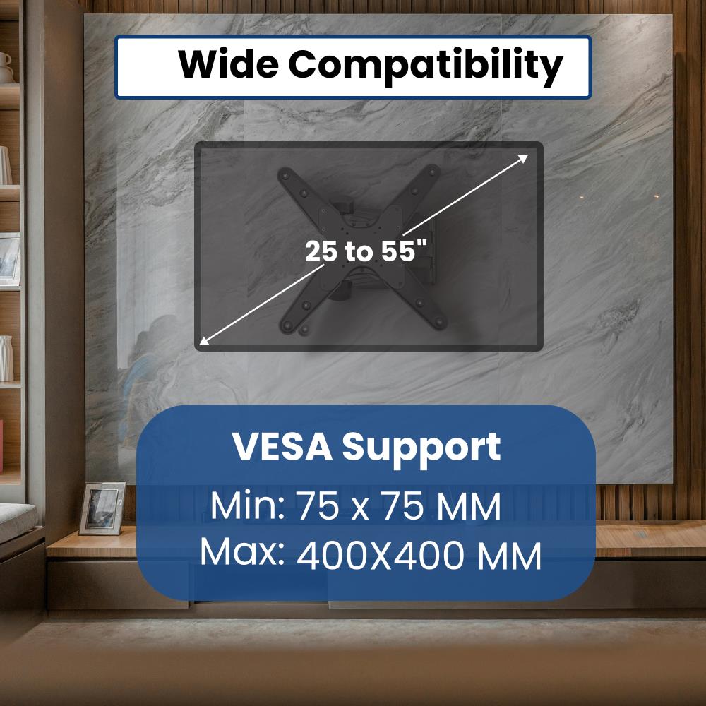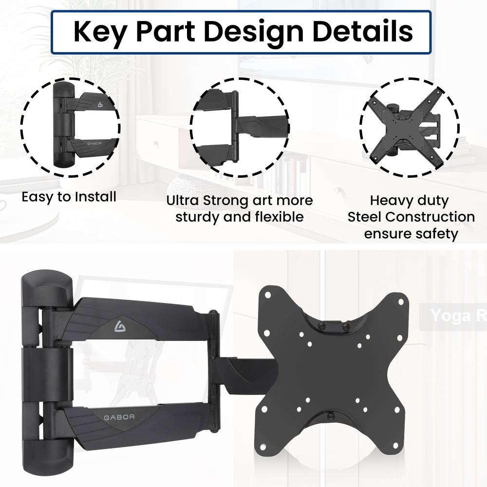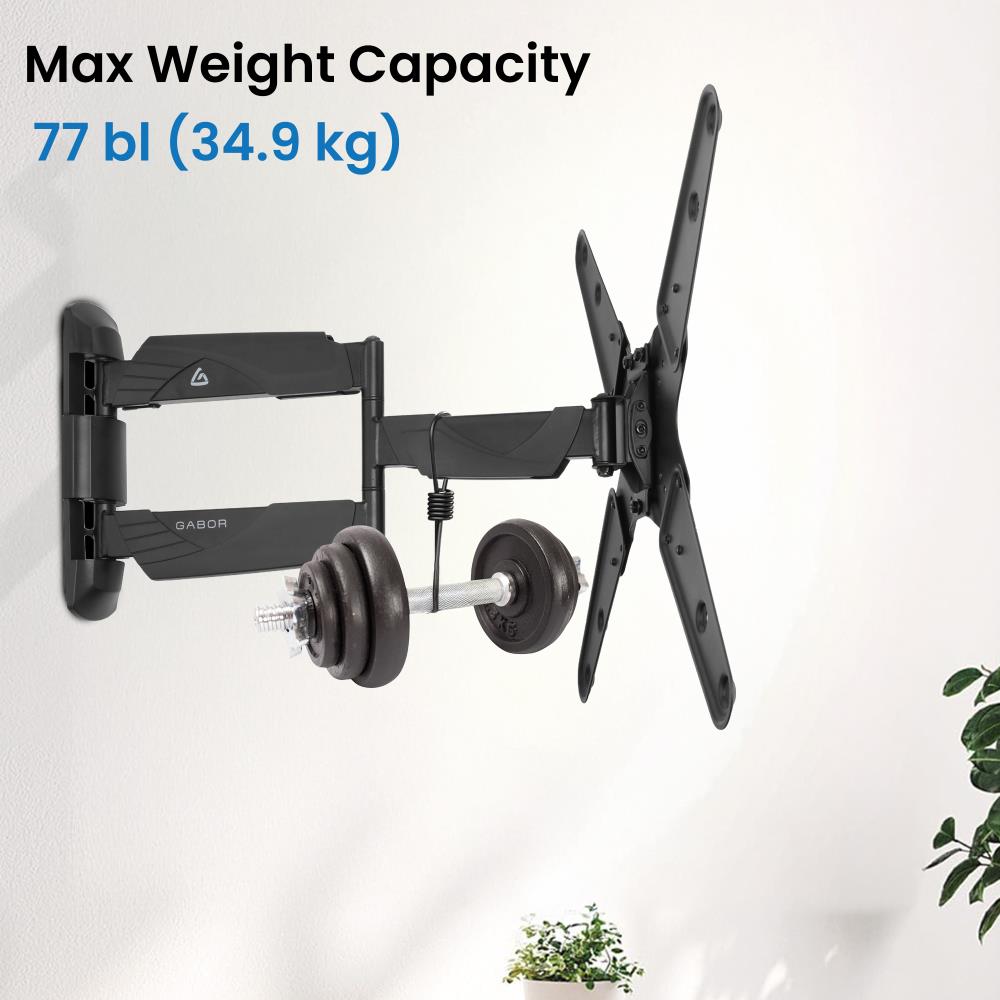 The Gabor FSM-M Full-Swing Medium Wall Mount is built to securely support 25 to 55" flat-panel TVs weighing up to 77 lb while offering flexible positioning for a better viewing experience. Its durable steel construction provides dependable strength, and the slim design allows the TV to retract close to the wall for a clean, space-saving look. With support for VESA patterns from 75 x 75 to 400 x 400mm, it is compatible with a wide range of displays.