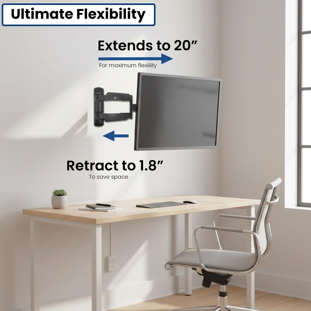 Designed for convenience and precision, this mount features smooth full-motion adjustment with up to 180° of pivot, -15° to 10° tilt for glare reduction, and ±3° post-installation leveling for accurate alignment. The 1.8 to 20" extension lets you position your TV exactly where you need it, even around corners. Integrated cable management and decorative covers keep wiring hidden, while the included hardware, drilling template with dust pocket, and bubble level help simplify installation.