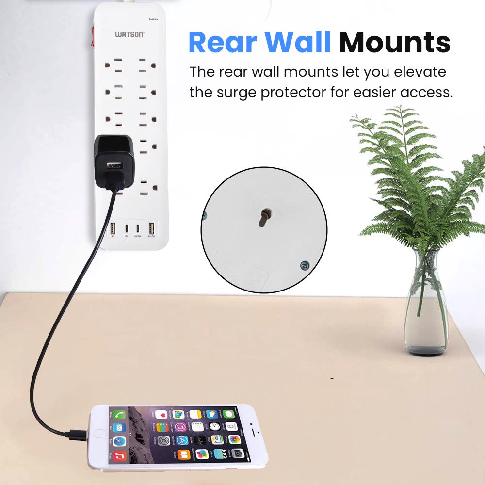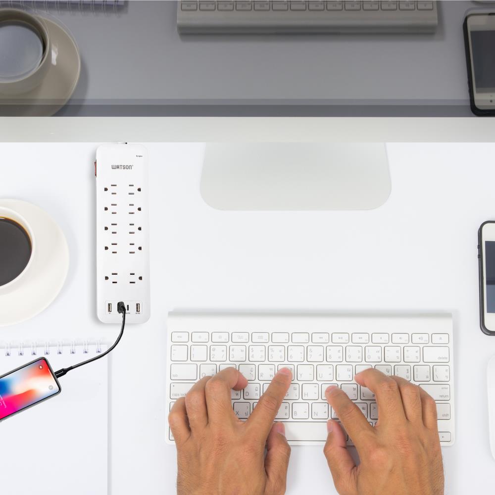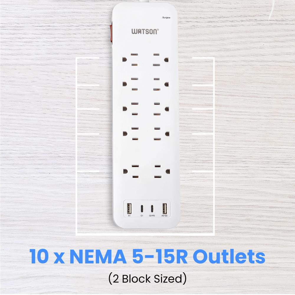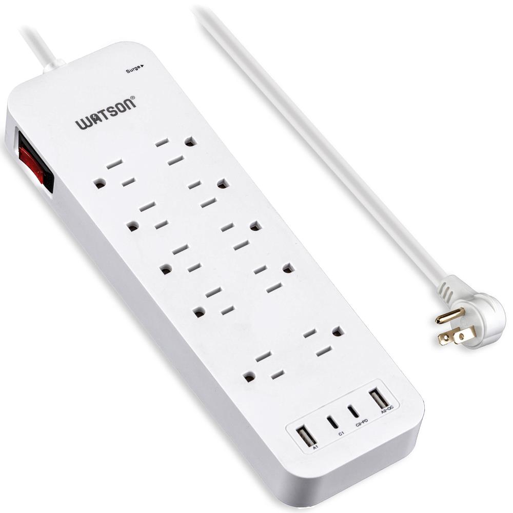 Elevate your power management with the Watson 10-Outlet Surge Protector with USB, the ultimate solution for keeping all your electronics safe and powered. This sleek, white surge protector turns a single outlet into ten, offering unmatched versatility and protection. It features ten NEMA 5-15R outlets, each equipped with up to 2450 joules of surge protection to shield your valuable devices from power spikes and fluctuations. Two outlets are generously spaced to accommodate oversized plugs without blocking access to neighboring outlets.