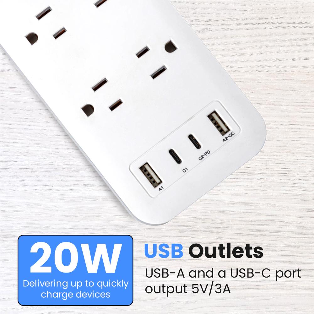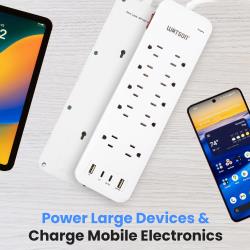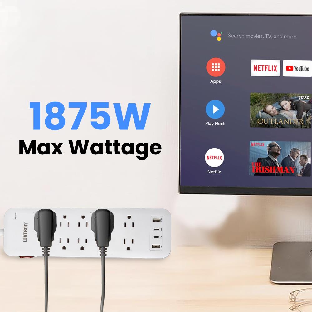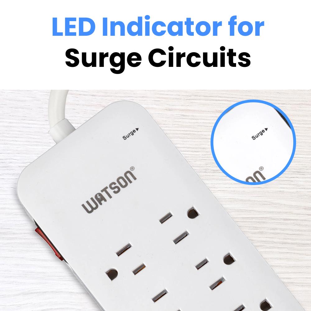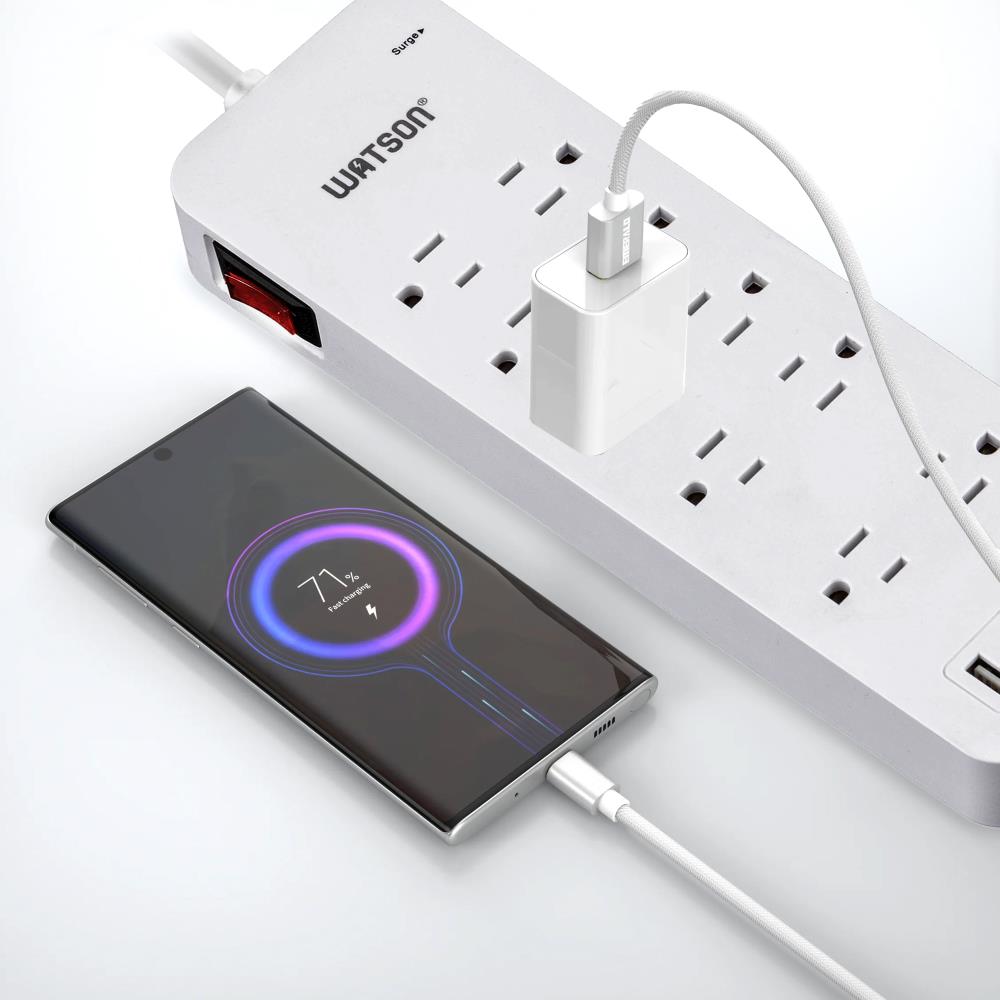 Elevate your power management with the Watson 10-Outlet Surge Protector with USB, the ultimate solution for keeping all your electronics safe and powered. This sleek, white surge protector turns a single outlet into ten, offering unmatched versatility and protection. It features ten NEMA 5-15R outlets, each equipped with up to 2450 joules of surge protection to shield your valuable devices from power spikes and fluctuations. Two outlets are generously spaced to accommodate oversized plugs without blocking access to neighboring outlets.