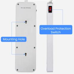 The 6' cord with a right-angle NEMA 5-15P plug ensures a clean, flush fit against the wall, keeping unsightly cords out of sight and maintaining access to nearby outlets. LED indicators let you quickly check the surge protection status, while rear wall mounts offer a clutter-free solution for off-the-ground placement, making it easy to reach and manage your connections.