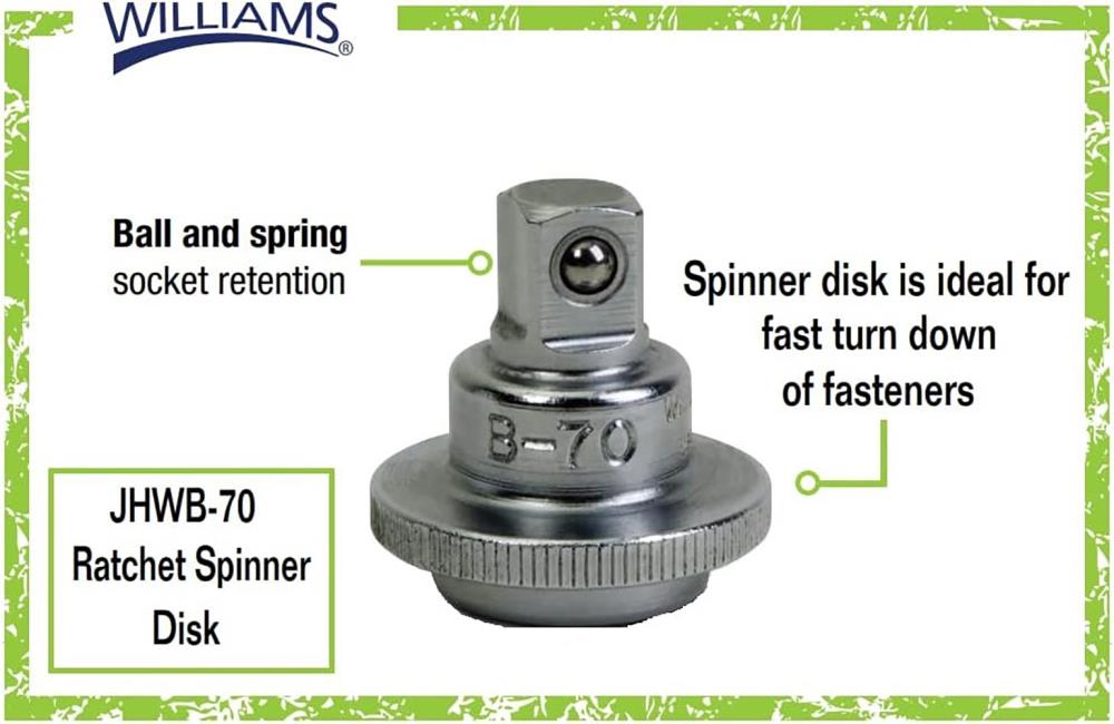 The Williams 3/8" Drive Ratchet Spinner Disc is a practical accessory designed to improve speed and control when working with sockets. Its ball and spring socket retention mechanism helps keep sockets secure during use while still allowing fast changes when needed.