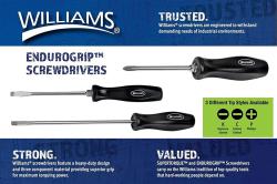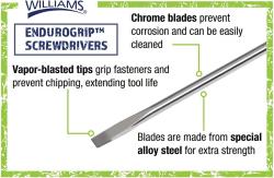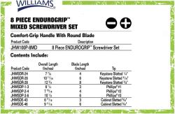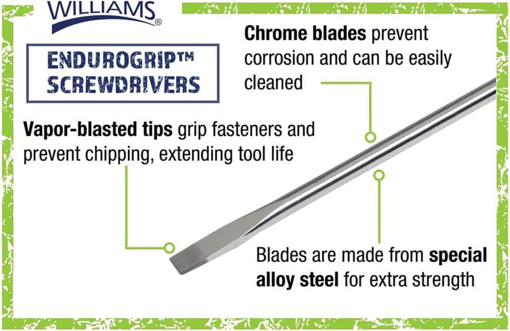 The Williams Endurogrip™ Mixed Screwdriver Set (8 Piece) is a dependable, everyday set built for technicians, mechanics, and anyone who needs consistent control at the fastener. Each driver is designed around the Endurogrip™ handle concept—an ergonomic, comfortable grip that helps you keep steady pressure and reduce hand fatigue during repetitive turning. Whether you’re doing shop maintenance, automotive trim work, light industrial service, or household repairs, this set is made to feel secure in the hand and responsive in use.