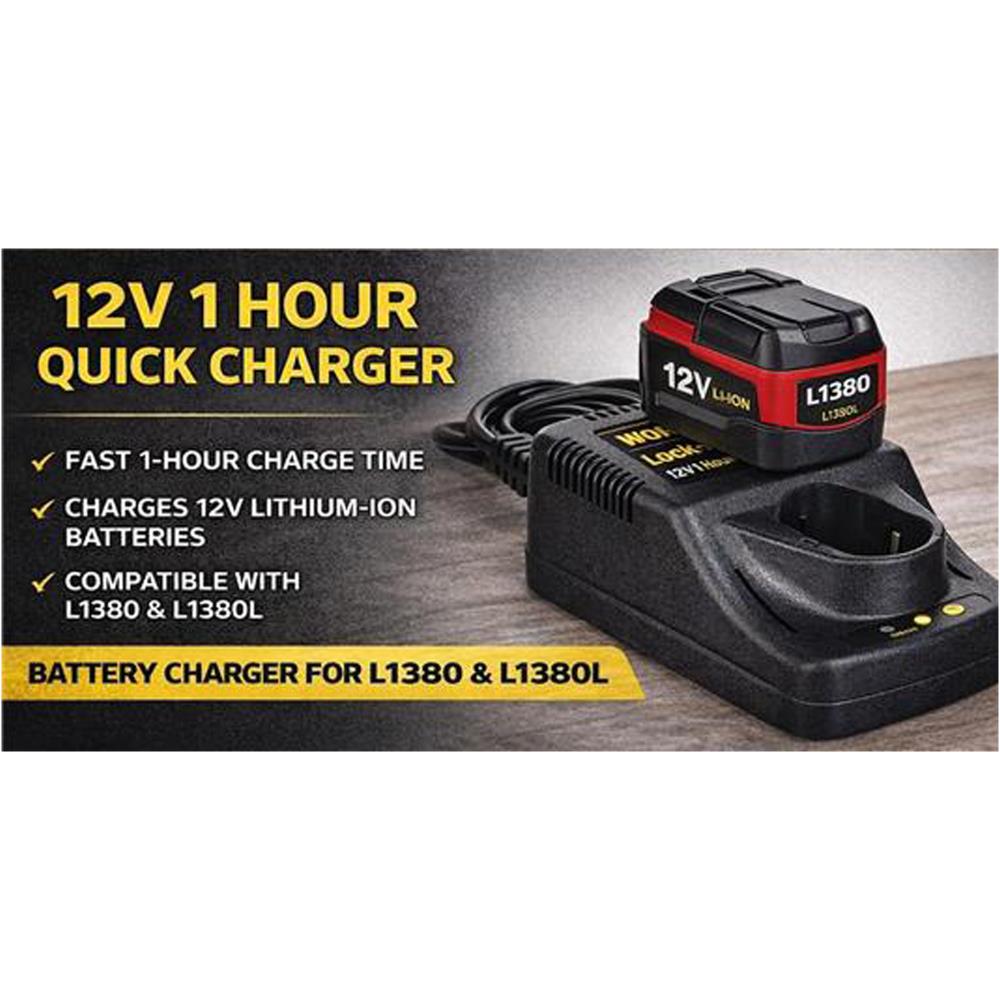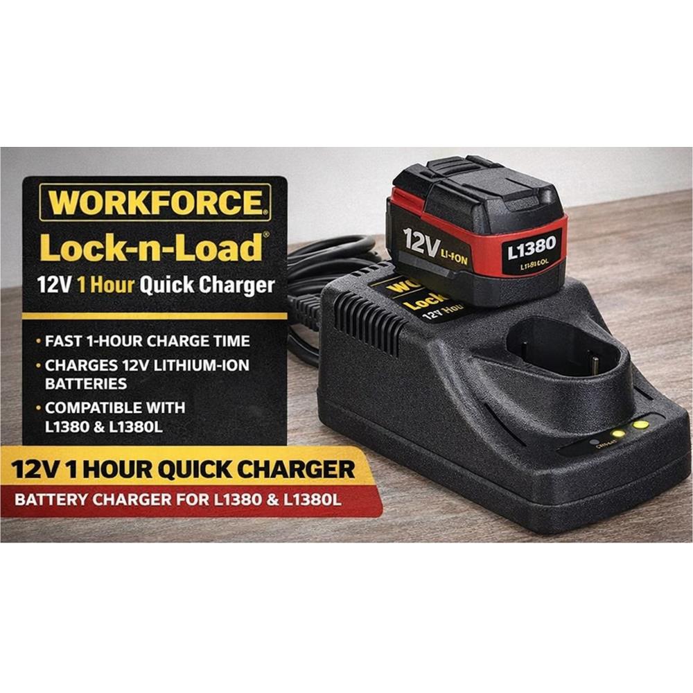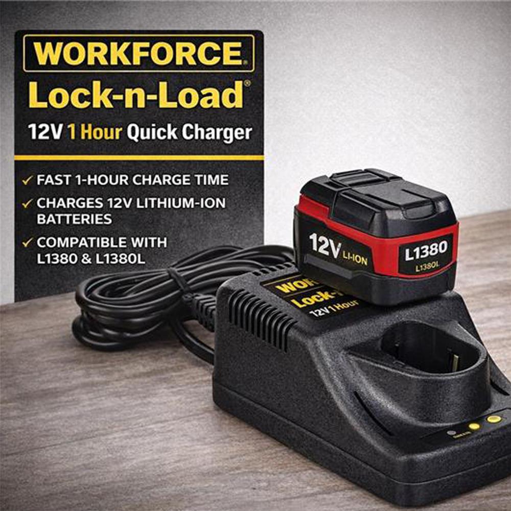 - The Workforce Lock-n-Load 12V 1 Hour Quick Charger is designed to deliver fast, reliable charging for compatible L1380 and L1380L lithium-ion batteries. It helps reduce downtime so your tools stay powered and ready for use at home, in the workshop, or on the jobsite.
