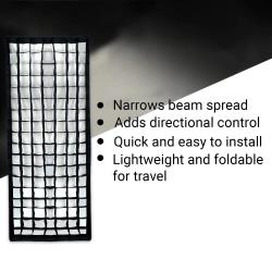 Installation is a breeze—simply attach the grid to the recessed touch-fastener strips on the front of the BoomBox. When used over the BoomBox's diffusers, it maintains a soft, diffused light quality while enhancing light directionality. This ensures you get the best of both worlds: a controlled beam without sacrificing the soft diffusion.